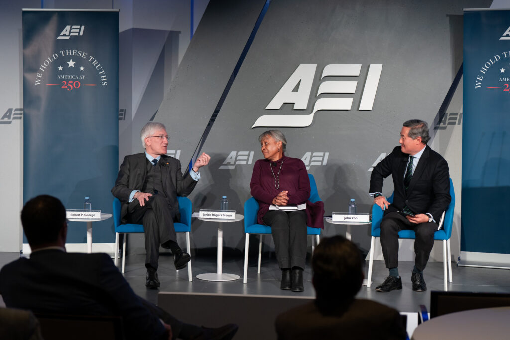 In the fourth symposium of the “We Hold These Truths: America at 250” initiative held at AEI on December 2, 2024, legal scholars and political scientists discussed how the founding generation viewed the “unalienable rights” immortalized by the Declaration of Independence. AEI’s John Yoo opened with a reading from the preamble. Former Circuit Judge Janice Rogers Brown examined the founders’ understanding of the people’s right to pursue happiness, while AEI’s Robert P. George explored the relationship between the pursuit of happiness and the political common good. During the second panel, the University of Notre Dame’s Michael Zuckert discussed equality’s implications on government authority and the comprehensive nature of the right to pursue happiness. University of Dallas’s Daniel Burns contrasted Lockean natural rights with the Declaration’s vision of natural rights, and Claremont McKenna College’s Charles R. Kesler closed by showing how the Committee of Five’s edits transformed Jefferson’s draft into the declaration we know today.